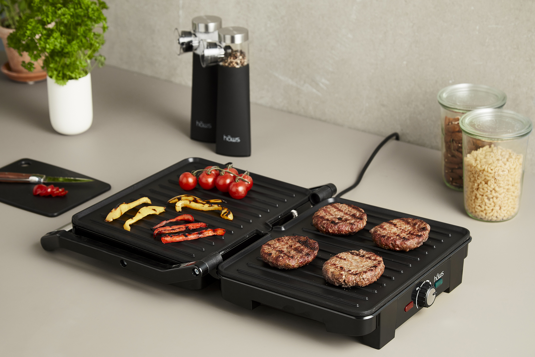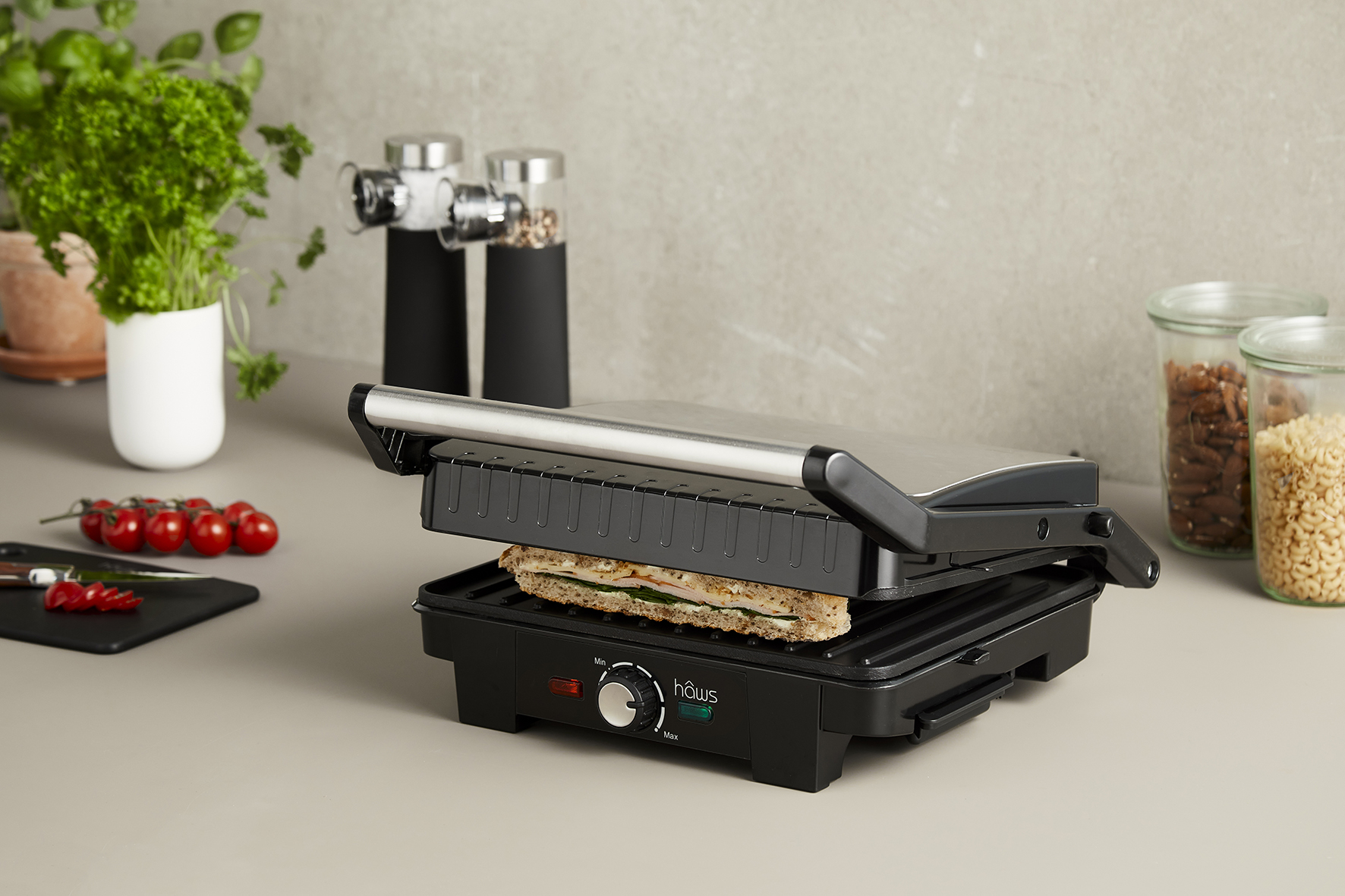 Hâws bord- og paninigrill kan uden problemer både grille kød, frisk, grøntsager eller sandwich. Belægningen på pladerne er af ILAG hvilket betyder de er PFAS fri. Den kan åbnes hele 180 grader op, hvilket gør det muligt at have dem stående på køkkenbordet. Det gør det nemt for dig at forlænge grillsæsonen til at vare hele året.