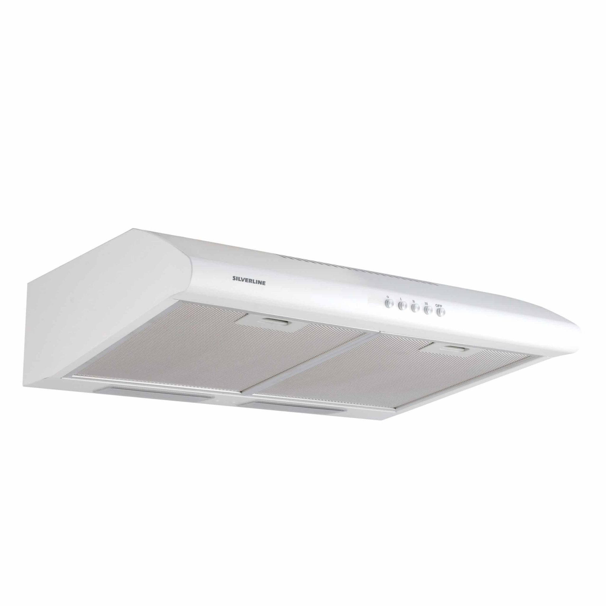 Hvid emhætte til indbygning i et skab over kogesektionen.