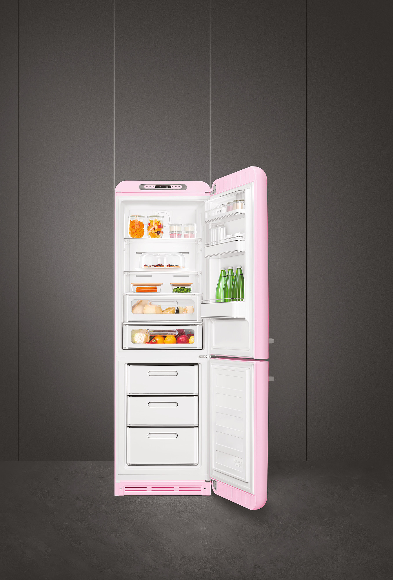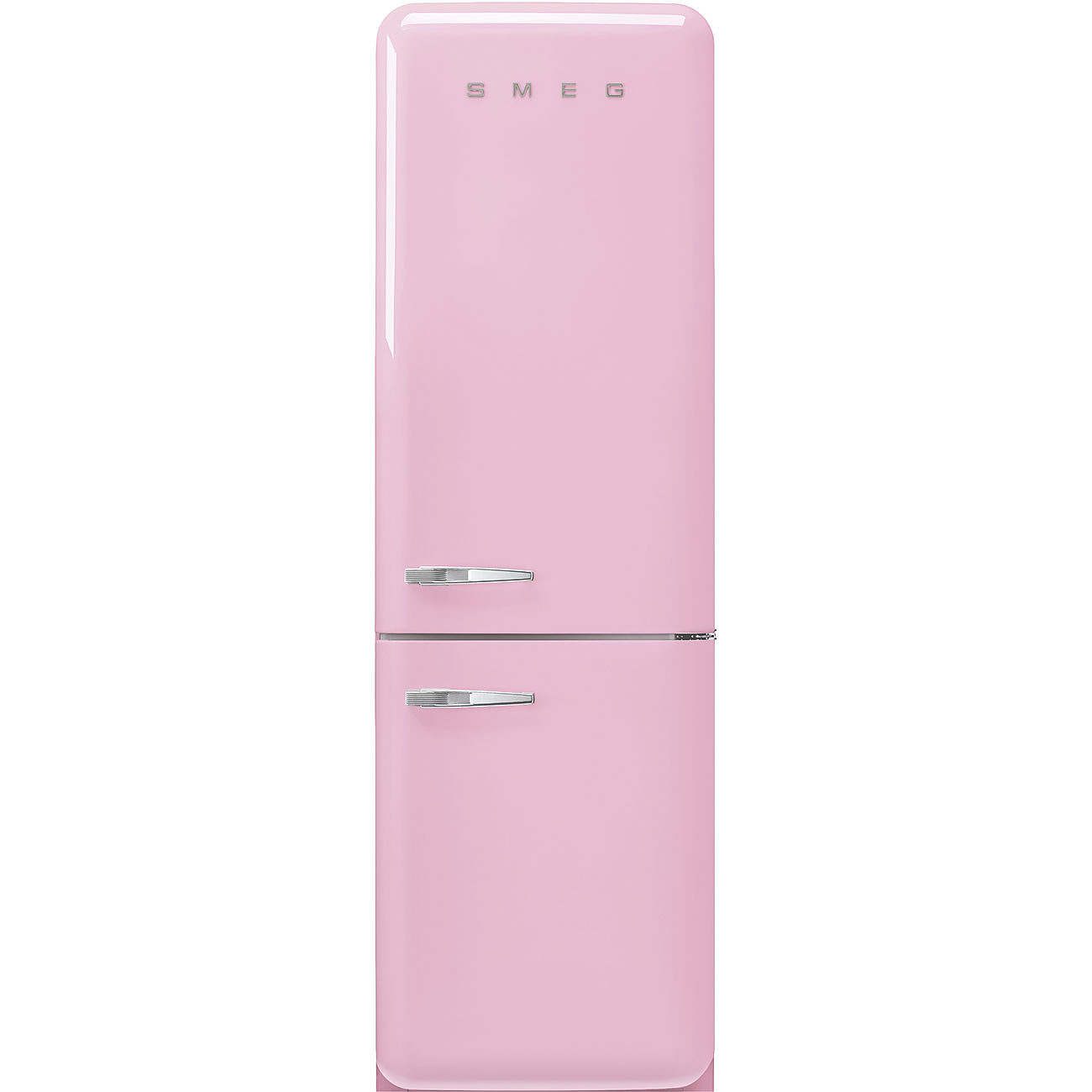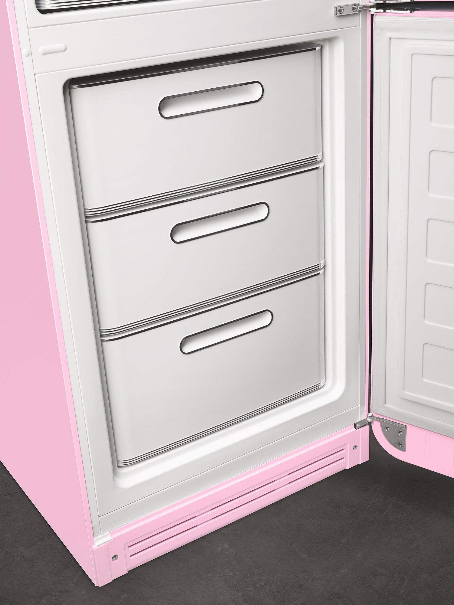 Kombineret køle-/fryseskab fra Smeg i lyserød med 3 fryseskuffer, No Frost og Multi Flow kølesystem Læs hele beskrivelsen