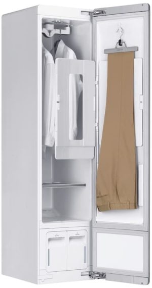 LG Styler S3WF opfrisker tøj med TrueSteam, bevægelige bøjler og integreret buksepres. Skånsom lavtemperatur-tørring beskytter materialer, mens Wi‑Fi via ThinQ og stille drift gør hverdagsplejen enkel i et slankt design.